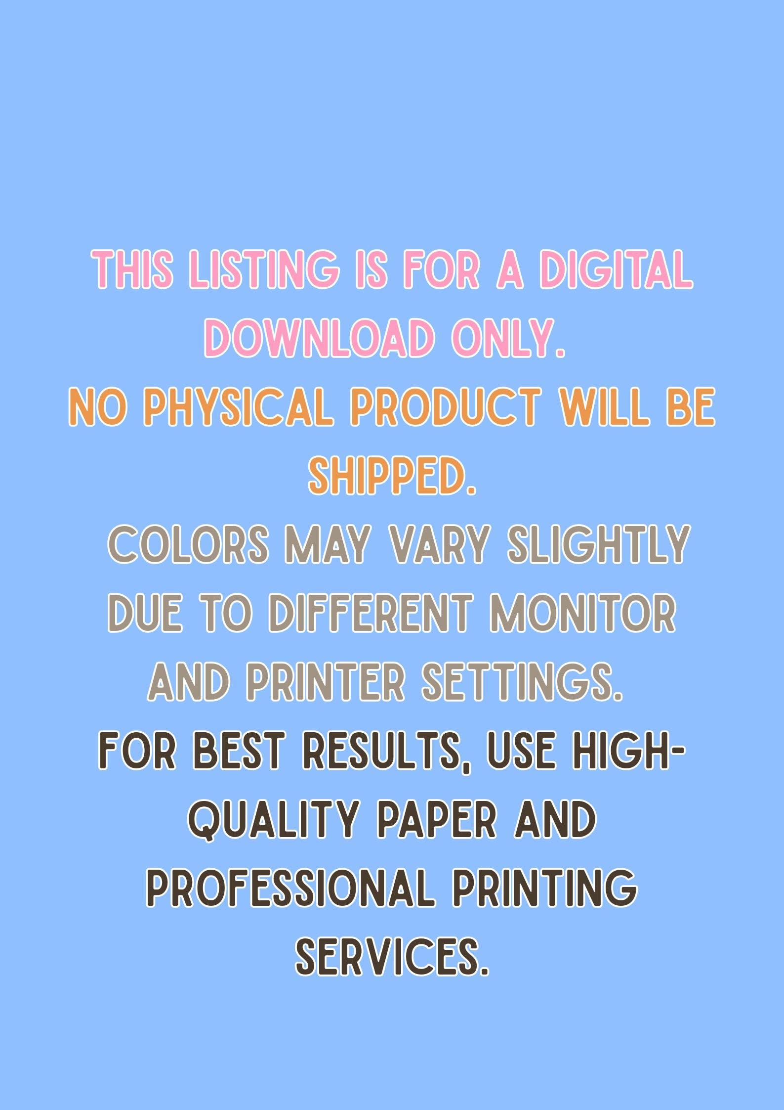 This listing is for a digital download only. No physical product will be shipped. Colors may vary slightly due to different monitor and printer settings. For best results, use high-quality paper and professional printing services.